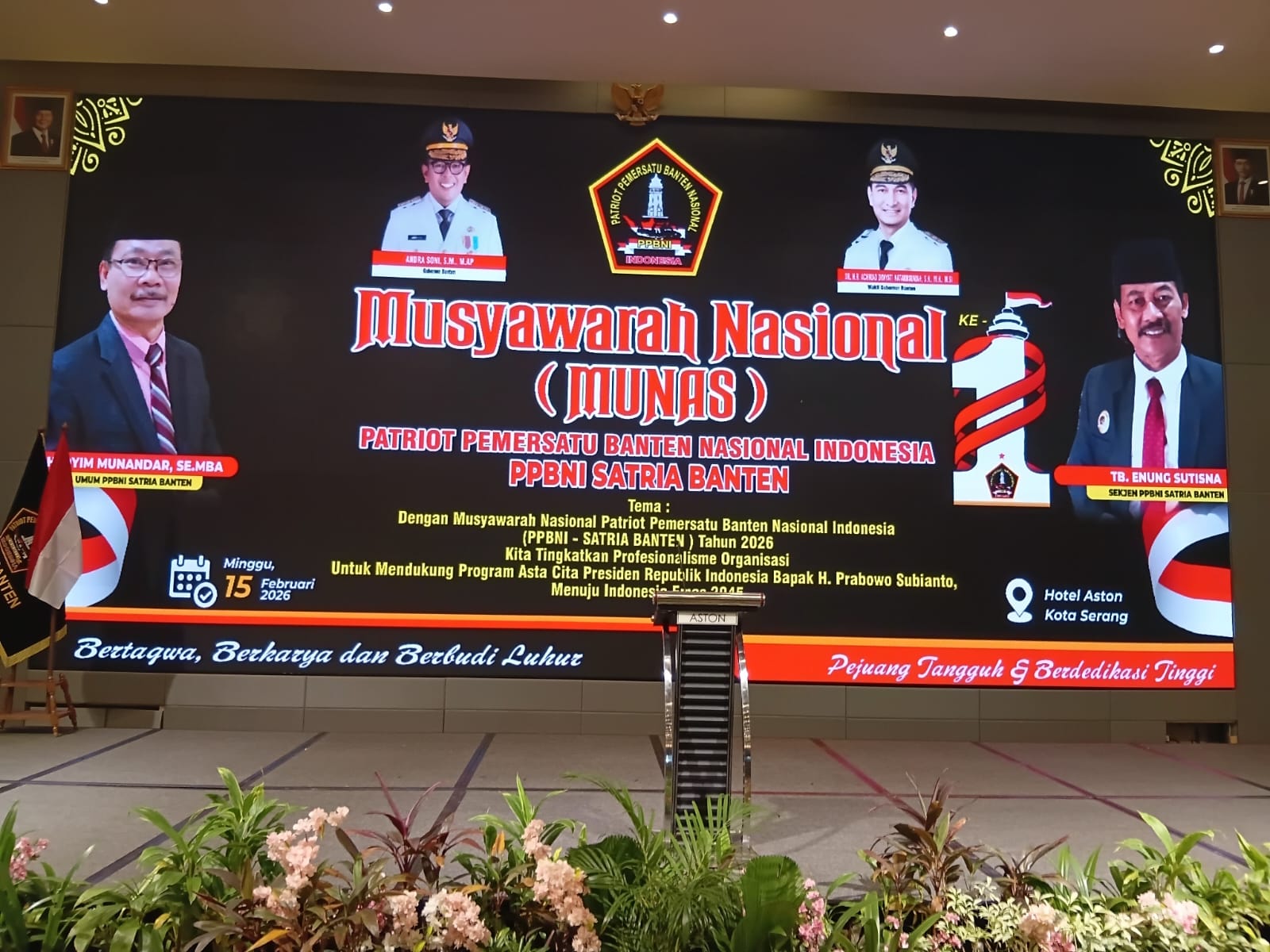 Hari ini,minggu 15 februari 2026 bertempat di Hotel ASTON Kabupaten Serang Provinsi Banten.salah satu Organisasi masa yaitu PPBNI (Patriot Pemersatu Banten Nasional Indonesia) atau yang biasa disebut SATRIA BANTEN mengadakan acara MUNAS (Musyawarah Nasional),dalam kesempatan ini yang dihadiri oleh Gubernur Banten ‘Andra Soni,S.M, M.A.P. Wakil Gubernur Banten ‘Dimyati Natakusumah’ Kepala Badan Narkotika Nasional ‘KOMJEN POL Dr.Suyuti Aryo Seto SH.SIK.MSi Bupati Serang ‘H.M Najib Hamas SE serta jajaran forkompinda Provinsi Banten dan Kabupaten Serang.